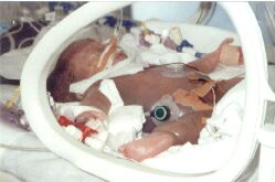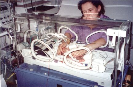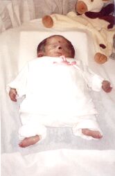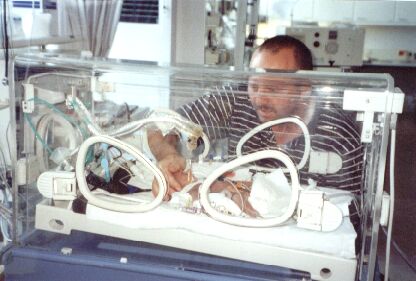 Toen ik er 18 uur aan had gelegen, het was toen 17 mei (mijn eigen verjaardag) 9:00 in de ochtend, kwam de gyn. zeggen dat ze Mandy gingen halen. Ik werd klaargemaakt voor de OK en om 10:02 is onze dochter Mandy geboren: 644 gram zwaar in een zwangerschap van 27/4 weken.