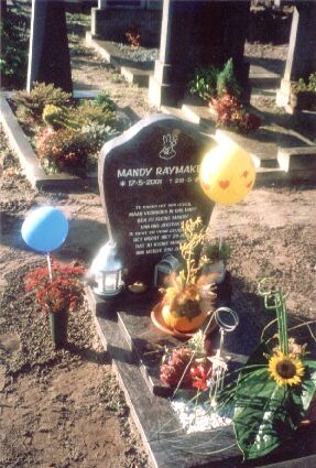 Op vrijdag 1 juni hebben we Mandy begraven in gesloten kring en zonder kinderen en daarna hebben we Mandy naar haar laatste rustplaats gebracht. Ze is begraven in een heel mooi rotan mandje. We hadden gekozen voor niet veel bloemen. Omdat het maar een klein plekje was zou je dat niet meer zien en dat vonden wij jammer.